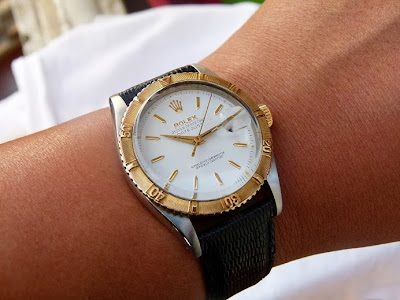 ROLEX Thunderbird Ref.6609 produksi kwartal pertama tahun 1958. Original acrylic crystal, crown dan jarum. Dial professionally repainted dengan kualitas yang baik. Roulette date, untuk tanggal angka genap berwarna merah dan tanggal ganjil berwarna hitam. Diameter 36mm. Movement automatic cal.1065. Rotating bezel terbuat dari solid gold. Dauphine hands. Strap dan buckle generik.