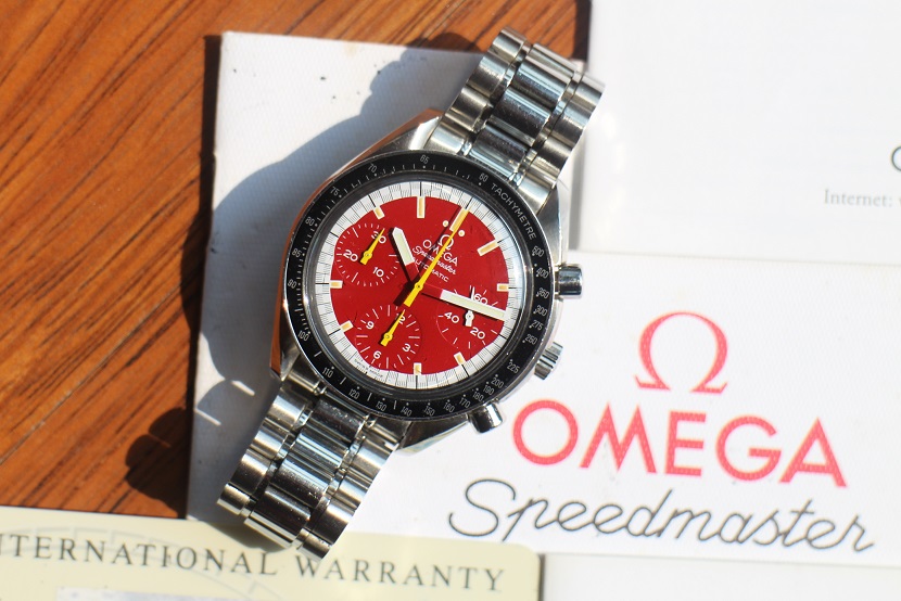 OMEGA pertama kali bekerja sama dengan Michael Schumacher pada akhir tahun 90-an dengan membuat seri khusus dengan warna-warna yang cerah. Diameter casing 39mm tanpa crown. Warna dial merah dengan jarum kuning dan putih. Plexy glass. Menggunakan automatic chronograph movement. Kondisi jam masih sangat bagus dan dijual lengkap dengan box dan paper.